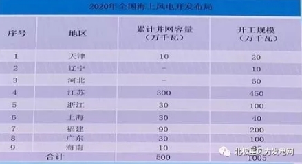 可再生能源發(fā)展十三五規(guī)劃顯示,積極穩(wěn)妥推進(jìn)海上風(fēng)電開(kāi)發(fā),到2020年,開(kāi)工建設(shè)1000萬(wàn)千瓦,確保建成500萬(wàn)千瓦。