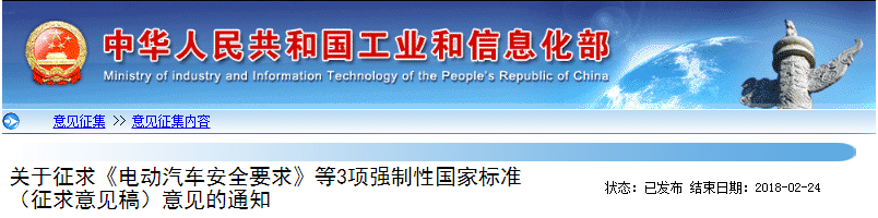 工信部發(fā)布了關(guān)于征求《電動汽車安全要求》等3項(xiàng)強(qiáng)制性國家標(biāo)準(zhǔn)(征求意見稿)意見的通知,具體內(nèi)容如下: