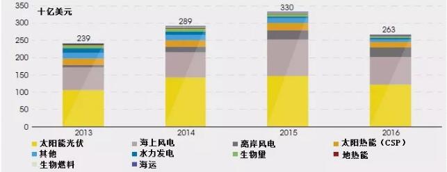 (1)盡管2016年投資下降,但可再生能源的裝機容量已經達到創(chuàng)紀錄水平。政策變化對投資水平的影響較大。