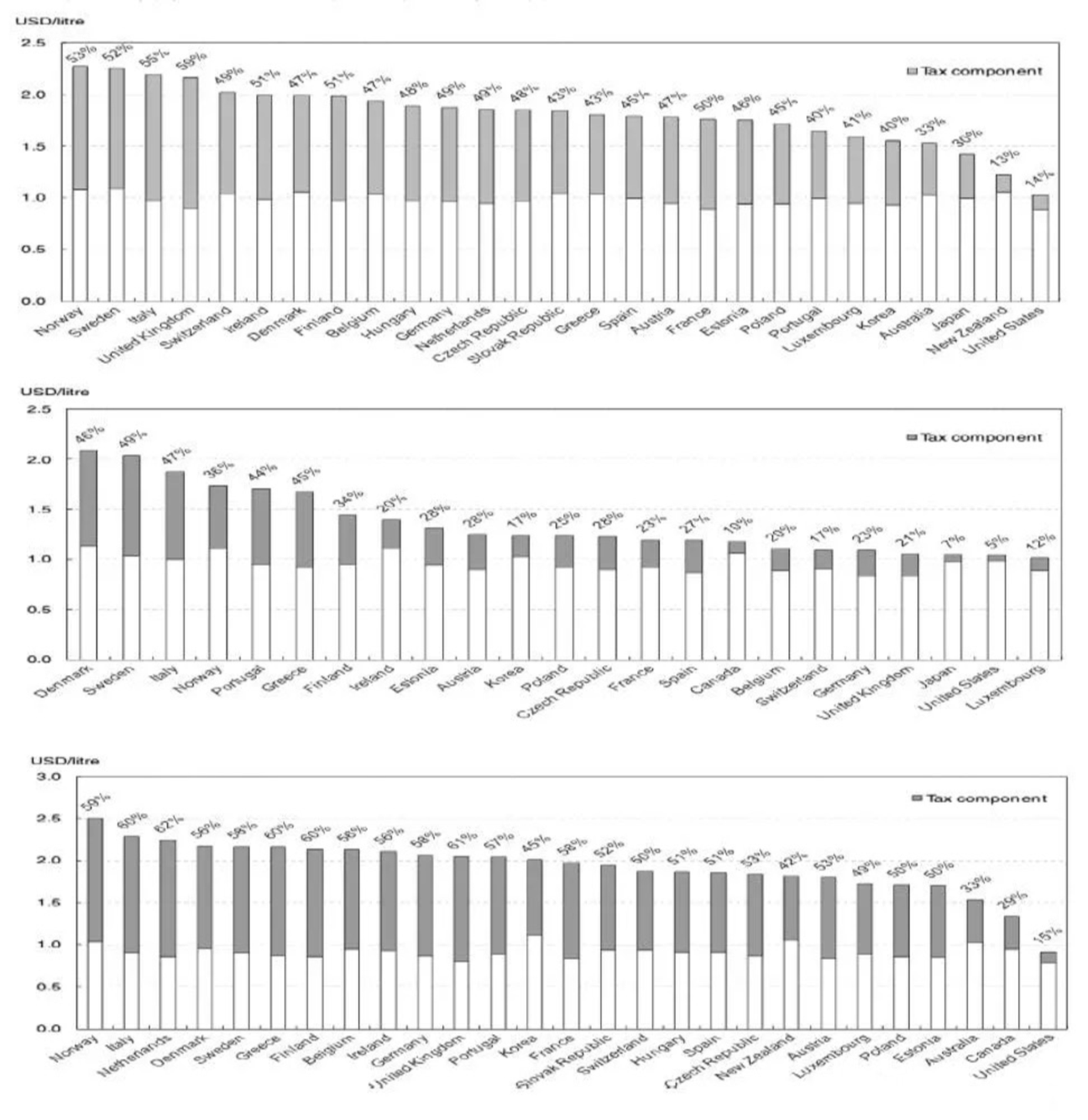 圖1IEA能源價(jià)格與稅收——2013年第4季度:車(chē)用柴油,圖2高級(jí)無(wú)鉛汽油,(中95號(hào))和輕燃料油