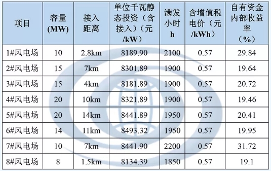 某縣經(jīng)過(guò)對(duì)當(dāng)?shù)仫L(fēng)資源分析后,初步估算有112MW的可開發(fā)容量,共8個(gè)項(xiàng)目,各項(xiàng)目指標(biāo)如下: