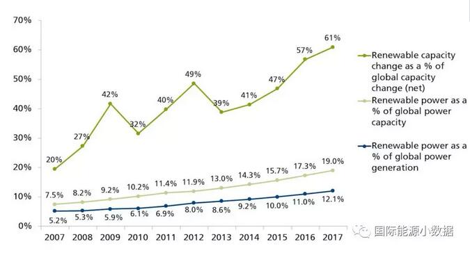 雖然2017年新增裝機的比例高達61%,但是當年在全球發(fā)電總裝機容量中占19.0%,而發(fā)電量僅占12.1%。