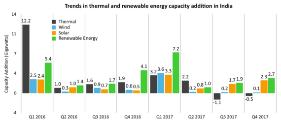 2017年,印度可再生能源裝機(jī)容量12.8吉瓦,新增煤電4吉瓦,這是印度可再生能源增量首次超過煤電。