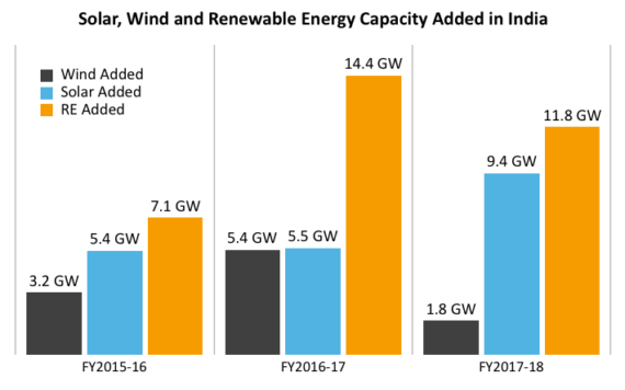 從絕對(duì)數(shù)量看,2017-18財(cái)年的產(chǎn)能增長(zhǎng)極其低迷。 2015-16財(cái)年,印度新能源與可再生能源部制定了增加4.46吉瓦并網(wǎng)可再生能源的目標(biāo),實(shí)際增加了7吉瓦以上。在2016-17財(cái)年,設(shè)定了16.66吉瓦的目標(biāo),但實(shí)際增加了11.3吉瓦。