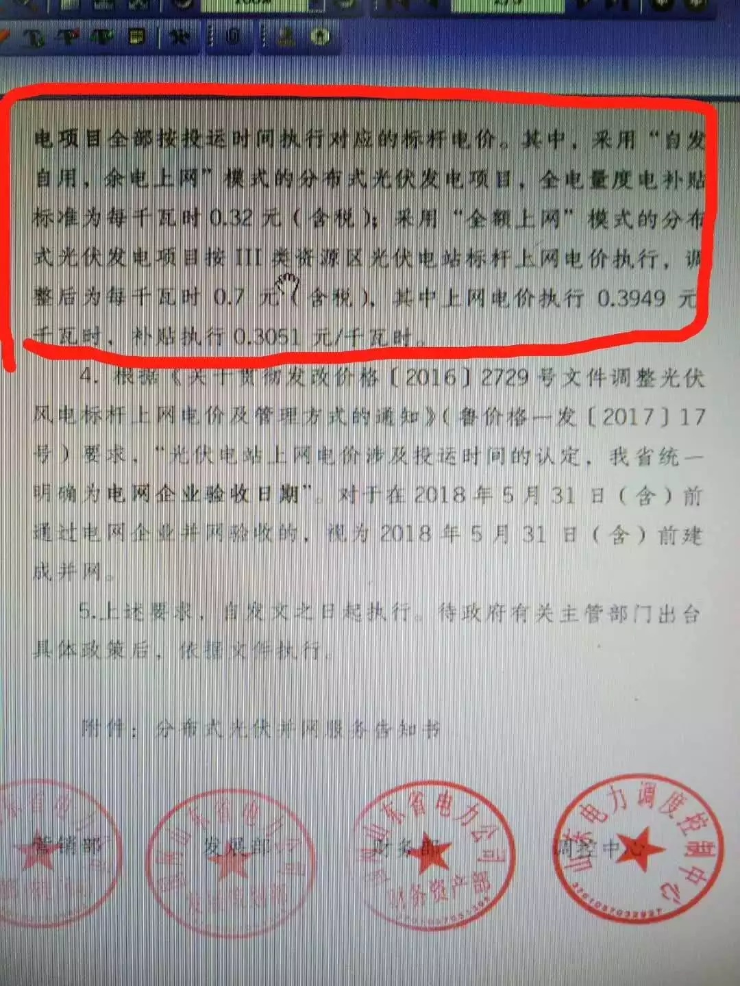 4.根據(jù)《關(guān)于貫徹發(fā)改價(jià)格[2016]2729號文件調(diào)整光伏風(fēng)電標(biāo)桿上網(wǎng)電價(jià)及管理方式的通知》(魯價(jià)格一發(fā)[2017]17號)要求,“光伏電站上網(wǎng)電價(jià)涉及投運(yùn)時(shí)間的認(rèn)定,我省統(tǒng)一明確為電網(wǎng)企業(yè)驗(yàn)收日期”。對于在2018年5月31日(含)前通過電網(wǎng)企業(yè)并網(wǎng)驗(yàn)收的,視為2018年5月31日(含)前建成并網(wǎng)。