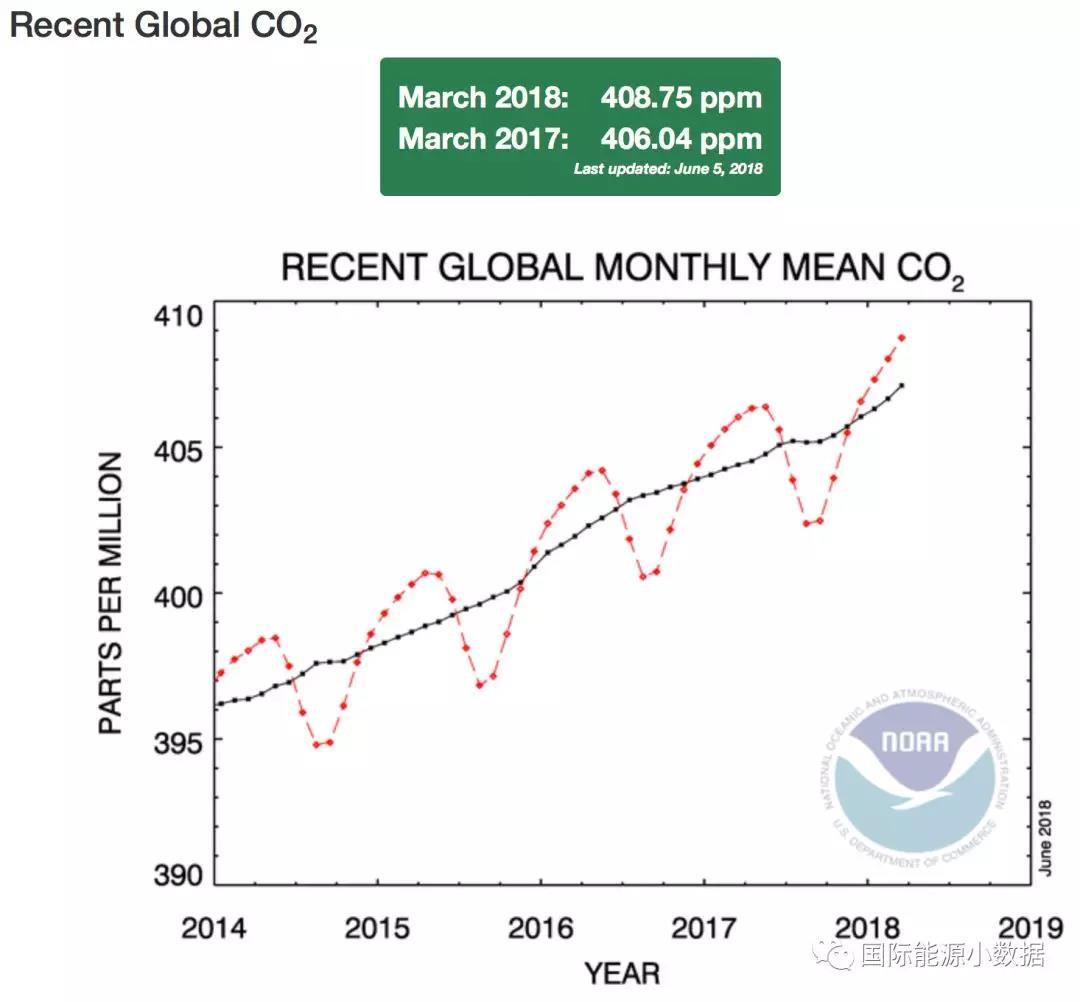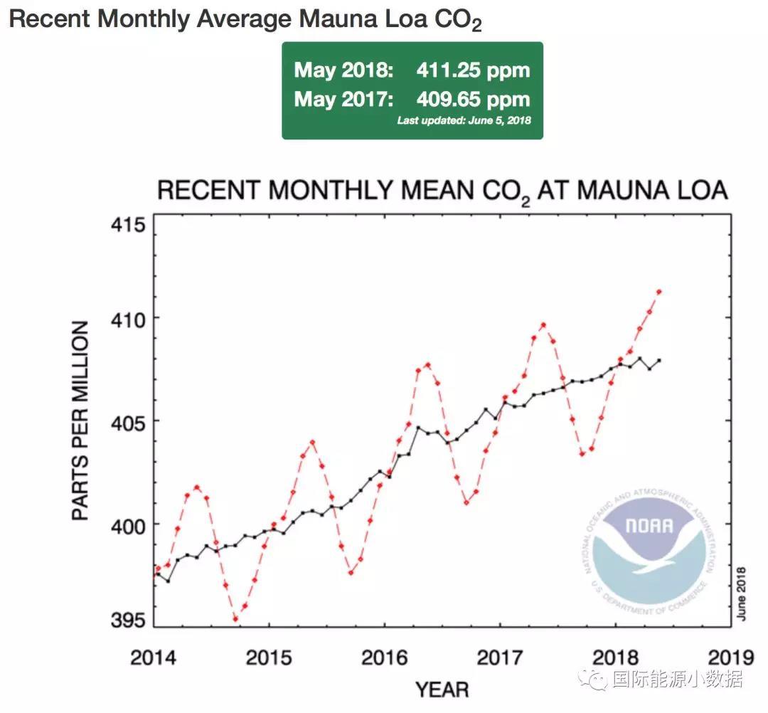 根據(jù)美國(guó)國(guó)家海洋和大氣管理局(英語(yǔ):National Oceanic and Atmospheric Administration,縮寫為NOAA)在夏威夷莫納羅亞(Mauna Loa)天文臺(tái)的觀測(cè),2018年5月份大氣中二氧化碳平均濃度達(dá)到411.25ppm,達(dá)到歷史最高點(diǎn)(去年同期濃度為409.65ppm)。