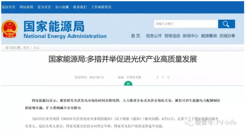 2018年6月12日,國家能源局官網(wǎng)發(fā)布《國家能源局:多措并舉促進光伏產(chǎn)業(yè)高質(zhì)量發(fā)展》,文件指出:關(guān)于戶用分布式光伏政策問題。對今年5月31日(含)前已開工未并網(wǎng)的自然人戶用分布式光伏,國家能源局正在與國家發(fā)改委、財政部研究,盡快通過適當(dāng)方式予以明確;