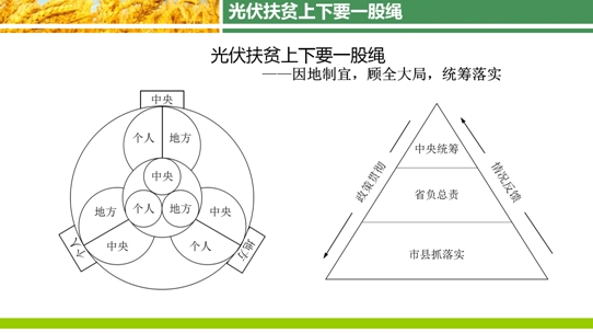 再說扶貧開發(fā)的上下萬眾一心。531光伏新政發(fā)布后,有說光伏界“心里涼涼的”,甚至一些熱衷于光伏扶貧的朋友也有說:新政之下光伏扶貧基本沒有什么可以探討的了?。我要說:扶貧在中央統(tǒng)籌,省負總責,市縣抓落實的基本結構下,與扶貧有關的政策制定與執(zhí)行人都要有政策的有序性和科學的增進感,同時還要以萬眾一心擰成一股繩來作扶貧開發(fā)的助推,來構成扶貧政策與目標的良好匹配??傊?,當下扶貧政策的貫徹,落實都要有上下一股繩且要擰得緊的方式來做(見附圖),才能開拓光伏扶貧的新局面。下節(jié)預告:光伏扶貧生態(tài)就是資源。