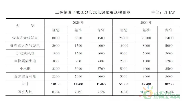 根據(jù)國家《能源發(fā)展“十三五”規(guī)劃》《2014—2020 年能源行動計劃》《可再生能源發(fā)展“十三五”規(guī)劃》《電力發(fā)展“十三五”規(guī)劃》相關(guān)內(nèi)容,2020 年分布式光伏發(fā)電、分布式天然氣發(fā)電開發(fā)規(guī)模達到國家規(guī)劃目標,2030 年分布式光伏發(fā)電、分布式天然氣發(fā)電開發(fā)規(guī)模應(yīng)滿足實現(xiàn)國家戰(zhàn)略目標的要求;分散式風(fēng)電、生物質(zhì)能發(fā)電、小水電和資源綜合利用開發(fā)規(guī)模達到相關(guān)規(guī)劃或資源量約束目標。