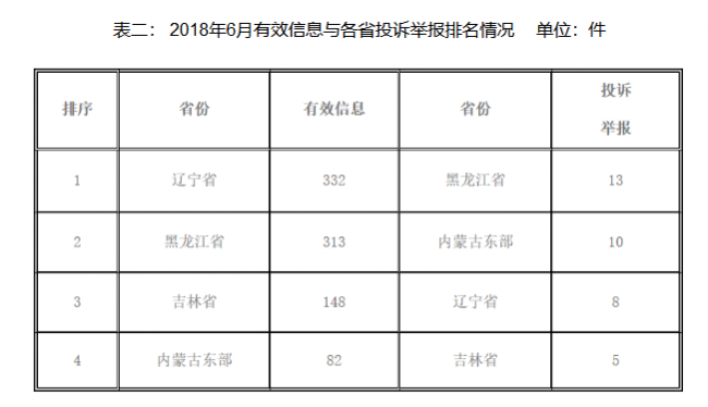 2018年6月,從12398能源監(jiān)管熱線收到的有效信息數(shù)量來看,遼寧省均居首位;從投訴舉報(bào)數(shù)量來看,黑龍江省居首位。(詳細(xì)情況見表二)