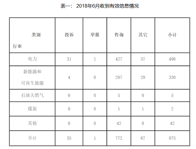 2018年6月,12398能源監(jiān)管熱線投訴舉報(bào)有效信息875件。按訴求性質(zhì)分類,投訴35件,占有效信息的4.00%;舉報(bào)1件,占有效信息的0.11%;咨詢772件,占有效信息的88.23%;其他方面67件,占有效信息的7.66%。