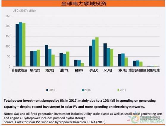 2017年全球電力投資額達(dá)7500億美元,同比下降6%。過(guò)去的十年,由于可再生能源項(xiàng)目開(kāi)發(fā)補(bǔ)貼政策的出臺(tái),以及升級(jí)、擴(kuò)大電網(wǎng)等措施,全球電力行業(yè)成為資本需求高的行業(yè)。資本需求不高的熱發(fā)電投資所占份額繼續(xù)下降。