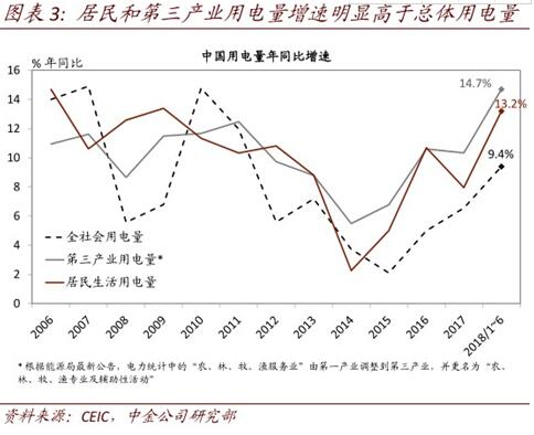 為何用電量增長持續(xù)超預(yù)期?我們認(rèn)為,這與中國目前特有的發(fā)展階段以及能源消費(fèi)結(jié)構(gòu)的快速轉(zhuǎn)變有關(guān),同時也受到環(huán)保相關(guān)政策的影響。分行業(yè)來看,居民用電和第三產(chǎn)業(yè)電耗的增速明顯超出總體水平(圖表3)。