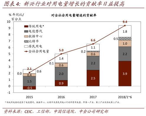 此外,近年隨著“新經(jīng)濟(jì)”行業(yè)快速增長,高電耗數(shù)據(jù)中心及數(shù)字貨幣“爆發(fā)式”增長大幅推高了總用電量。我們估算這些新經(jīng)濟(jì)行業(yè)對整體用電量增速的貢獻(xiàn)率已占到1.5個百分點(diǎn)左右。隨著中國快速進(jìn)入信息時代,無論是傳統(tǒng)行業(yè)的轉(zhuǎn)型和“數(shù)字化”升級,還是新興互聯(lián)網(wǎng)行業(yè)的快速發(fā)展,都帶來了數(shù)據(jù)收集、儲存和處理的爆發(fā)性需求。