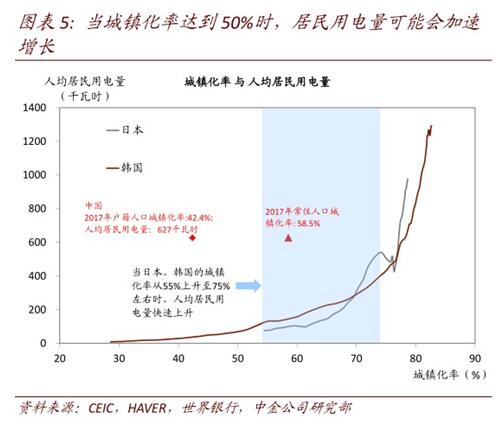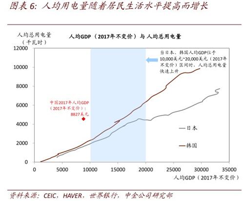 此外,相比歷史數(shù)據(jù),現(xiàn)今消費(fèi)電子產(chǎn)品快速的滲透可能進(jìn)一步推高居民用電的潛力。參照韓國和日本在城鎮(zhèn)化率和人均GDP與中國水平相當(dāng)時的經(jīng)驗(yàn)來看,我們預(yù)計(jì)未來幾年中國居民用電增速將保持在均年均10%左右的水平。