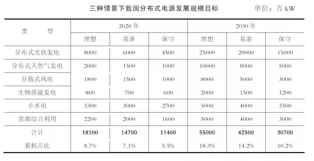 根據(jù)國家《能源發(fā)展“十三五”規(guī)劃》《2014—2020 年能源行動計劃》《可再生能源發(fā)展“十三五”規(guī)劃》《電力發(fā)展“十三五”規(guī)劃》相關(guān)內(nèi)容,2020 年分布式光伏發(fā)電、分布式天然氣發(fā)電開發(fā)規(guī)模達到國家規(guī)劃目標,2030 年分布式光伏發(fā)電、分布式天然氣發(fā)電開發(fā)規(guī)模應滿足實現(xiàn)國家戰(zhàn)略目標的要求;分散式風電、生物質(zhì)能發(fā)電、小水電和資源綜合利用開發(fā)規(guī)模達到相關(guān)規(guī)劃或資源量約束目標。