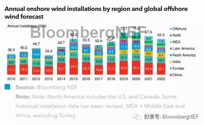 陸上風(fēng)電長(zhǎng)期預(yù)測(cè)(2023到2030年):我們預(yù)計(jì),全球陸上風(fēng)電裝機(jī)將達(dá)到70GW到103GW之間。我們的預(yù)測(cè)是基于《新能源市場(chǎng)長(zhǎng)期展望》(NEO),即彭博新能源財(cái)經(jīng)針對(duì)電力領(lǐng)域的長(zhǎng)期展望報(bào)告做出的。這一分析基于當(dāng)前政策正常實(shí)施,但2020年后沒(méi)有新的政策支持,且符合最低電力成本優(yōu)化的原則,即在每個(gè)國(guó)家以最低成本建設(shè)不同發(fā)電技術(shù),以滿(mǎn)足尖峰及平均用電需求,以及極端天氣的影響。