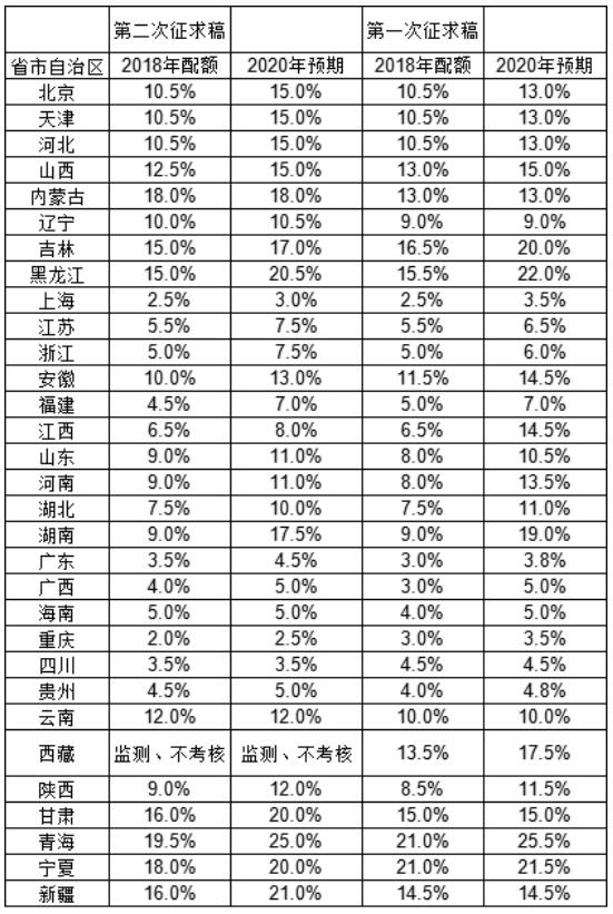 相較于2018年3月發(fā)布的第一版《征求意見稿》,配額指標總體上升。其中,可再生能源總配額指標中,2018年19個省份調(diào)高,2個省份保持不變,10個省份下調(diào); 2020年24個省份調(diào)高,2個省份保持不變,5 個省份下調(diào)。非水電可再生能源配額指標中,2018年12個省份調(diào)高,9個省份保持不變,10個省份下調(diào);2020 年14個省份調(diào)高,4個省份保持不變,13個省份下調(diào)。