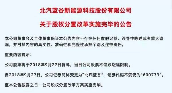 9月25日晚間,北汽藍(lán)谷新能源科技股份有限公司發(fā)布公告,稱公司股權(quán)分置改革方案已全部實施完畢,公司股票將于2018年9月27日復(fù)牌。