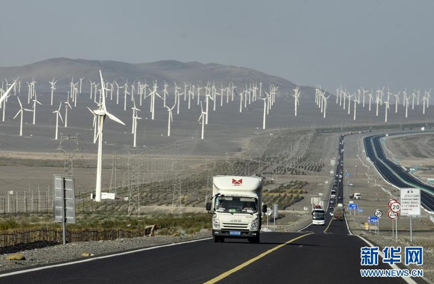 汽車行駛在新疆吐魯番市郊區(qū)風力發(fā)電場一旁的公路上(9月22日攝)。新華社記者趙戈 攝