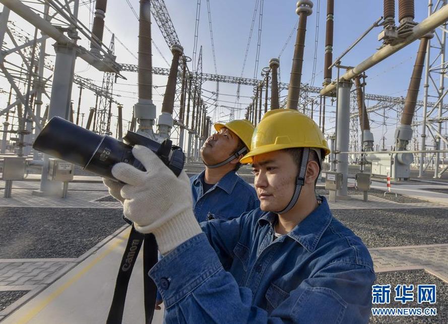 在吐魯番市750千伏變電站,兩位工作人員利用專用設(shè)備對電力設(shè)施進行檢查(9月18日攝)。新華社記者趙戈 攝