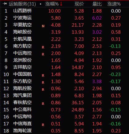 油價的下跌直接利好交通運輸行業(yè),特別是航空運輸板塊,截至收盤,山西路橋(5.280, 0.48, 10.00%)漲停,寧波海運(3.650, 0.20, 5.80%)漲幅近6%,華夏航空漲4.08%,南方航空漲逾2%,東方航空、中國國航、吉祥航空等漲幅超1%。