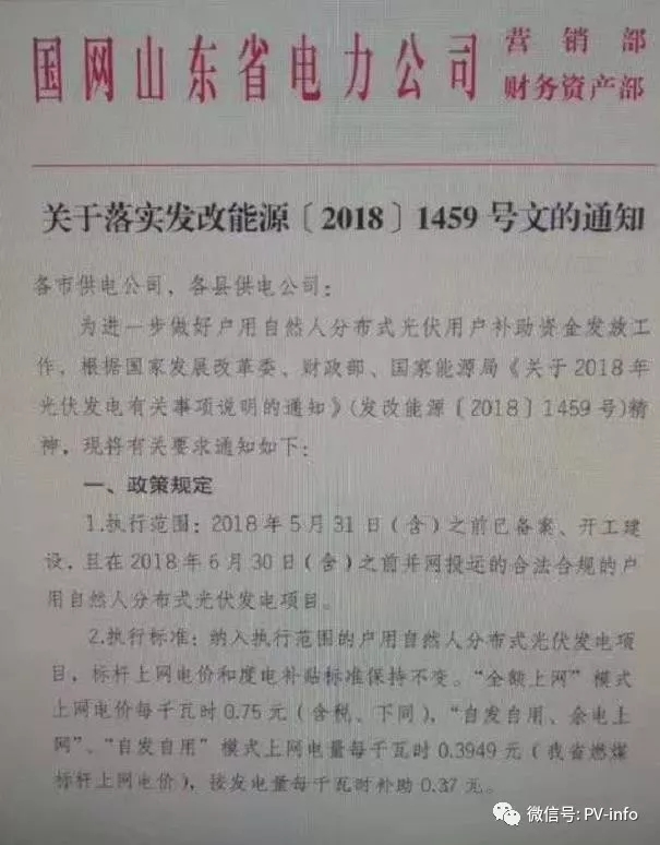 2018年12月13日,山東電網(wǎng)公司發(fā)布《關于落實發(fā)改能源〔2018〕1459號文的通知》,明確630前并網(wǎng)的戶用光伏予以補貼。