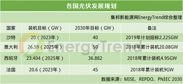 根據(jù)方案,計劃到2020年光伏裝機(jī)容量達(dá)8.409GW。2030年,西班牙74%的電力將來自可再生能源,占總能源需求的41%。到2050年,光伏裝機(jī)容量達(dá)50-60GW。此外,西班牙還計劃將儲能項目增加至6GW。