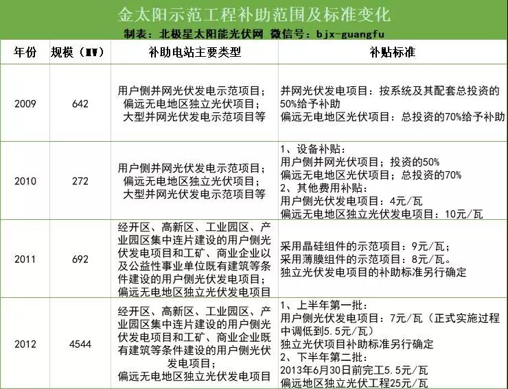 金太陽工程:2009年7月,財政部、科技部、國家能源局聯(lián)合發(fā)布《關(guān)于實施金太陽示范工程的通知》,計劃在2~3年內(nèi),采取財政補助方式支持不低于500MW的光伏發(fā)電示范項目。而具體的補助范圍和金額也在接下來的2009~2012年進行了逐年調(diào)整,見下表: