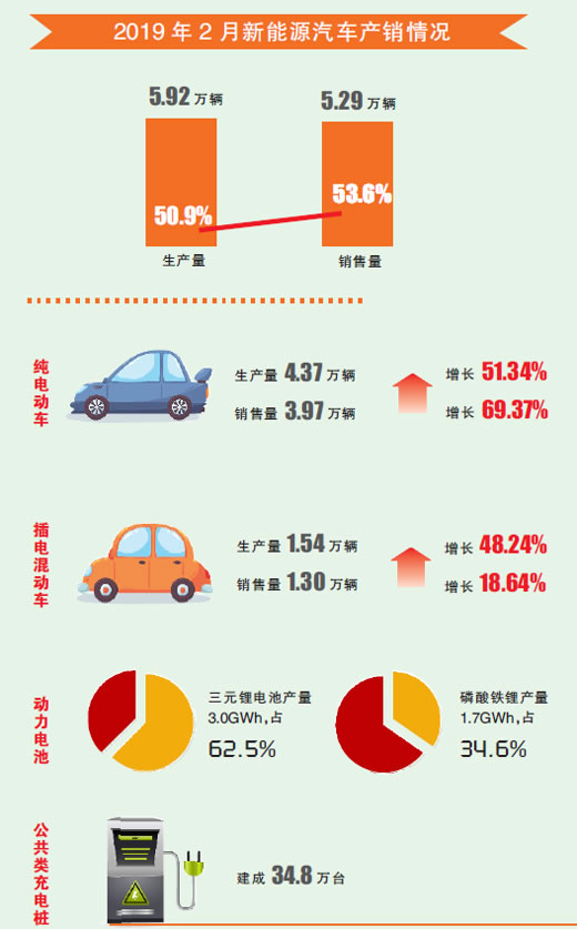 中國汽車工業(yè)協(xié)會3月11日發(fā)布的數(shù)據(jù)顯示,2月份我國新能源汽車產(chǎn)銷分別完成5.92萬輛和5.29萬輛,同比增長50.9%和53.6%。1-2月,新能源汽車產(chǎn)銷分別完成15萬輛和14.8萬輛,比上年同期分別增長83.5%和98.9%。這與整體汽車行業(yè)產(chǎn)銷量在今年前兩個月繼續(xù)下降的趨勢形成了鮮明對比。