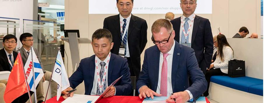 新大洋造船有限公司總經(jīng)理徐斌(左)和DNV GL大中國區(qū)總經(jīng)理科來在挪威海事展上簽署JDP協(xié)議。后排:SUMEC船舶公司總經(jīng)理徐剛(左)和SUMEC船舶公司技術(shù)經(jīng)理李國華。