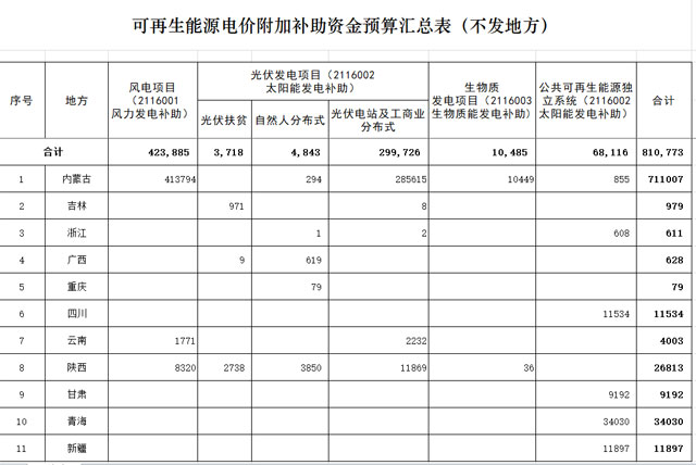 根據(jù)《通知》所附的《可再生能源電價(jià)附加補(bǔ)助資金預(yù)算匯總表》,風(fēng)電、光伏項(xiàng)目補(bǔ)貼約為42億元以及30.8億元。其中,光伏扶貧、自然人分布式和光伏電站及工商業(yè)分布式分別為0.37億元、0.48億元和29.97億元。其中,內(nèi)蒙古各類可再生能源補(bǔ)貼合計(jì)71億元,占比近九成,位居第一。