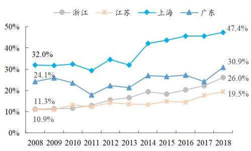 因此,東部沿海省份用電量結(jié)構(gòu)近年來逐步發(fā)生改變,外來電占比不斷攀升,浙江、江蘇、上海、廣東等地外來電占比由2008年的11.3%、10.9%、32.0%、24.1%上升至2018年的26.0%、19.5%、47.4%、30.9%。