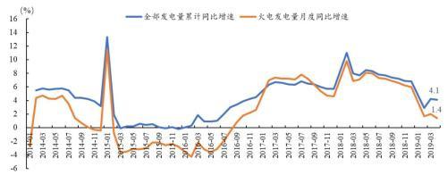 以最新數(shù)據(jù)為例,2019年1-4月,全國發(fā)電量同比增長4.1%,增速較上年同期回落3.6個百分點,其中火電發(fā)電量同比增長1.4%,增速較上年同期回落5.7個百分點。
