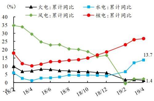2019年以來,南方部分地區(qū)來水普遍偏豐,水電持續(xù)高發(fā),1-4月水電發(fā)電量同比增長13.7%,增速比上年同期提高12.4個百分點。這讓火電受擠壓更加明顯。