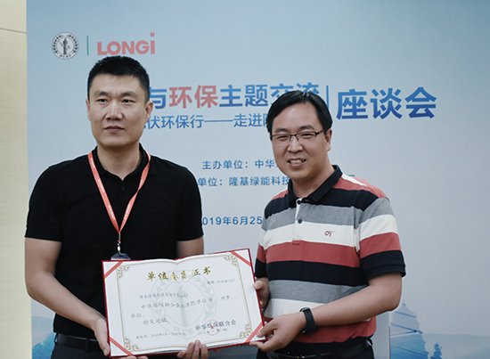中華環(huán)保聯(lián)合會有關(guān)負(fù)責(zé)人向隆基股份頒發(fā)會員證書