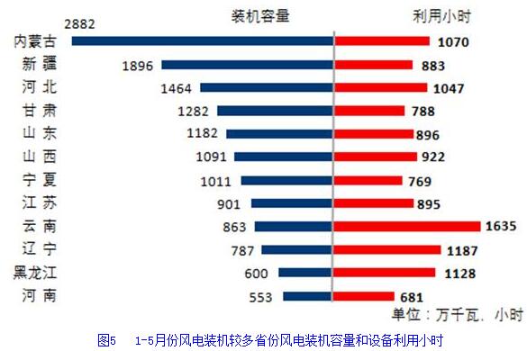 分類型看,1-5月份,全國水電設(shè)備平均利用小時為1300小時,比上年同期增加145小時。在水電裝機(jī)容量超過1000萬千瓦的8個省份中,水電設(shè)備平均利用小時均同比增加,福建和湖南同比增加超過600小時,分別增加636和661小時,廣東和云南同比增加超過300小時,分別增加306和304小時;全國火電設(shè)備平均利用小時為1728小時(其中,燃煤發(fā)電和燃?xì)獍l(fā)電設(shè)備平均利用小時分別為1783和971小時),比上年同期降低48小時。分省份看,全國共有14個省份火電設(shè)備利用小時超過全國平均水平,其中內(nèi)蒙古和河北超過2000小時,海南、湖北、安徽、江西、陜西和甘肅也超過1900小時,而云南和西藏僅為654和124小時。與上年同期相比,共有12個省份火電利用小時同比增加,其中四川增加318小時,湖北、廣西、貴州、新疆、重慶和北京增加超過100小時,而廣東和云南下降超過300小時,分別降低402和309小時,青海、湖南、江西、上海、福建、陜西、天津、浙江、河南和遼寧下降也超過100小時。全國核電設(shè)備平均利用小時2839小時,比上年同期降低75小時;全國并網(wǎng)風(fēng)電設(shè)備平均利用小時978小時,比上年同期降低24小時;全國太陽能發(fā)電設(shè)備平均利用小時532小時,與上年同期基本持平。