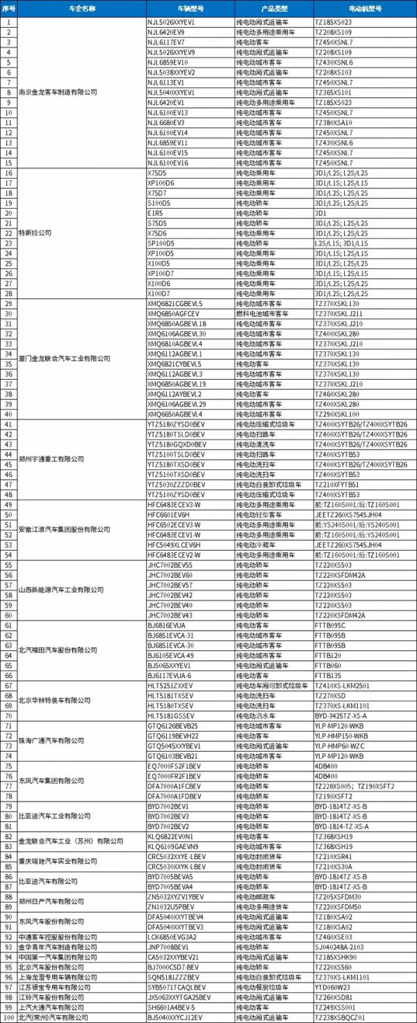 本批次共有25家車企的100個(gè)新能源車型列入,南京金龍客車列入新能源車型較多,總計(jì)15個(gè);特斯拉公司列入13個(gè)新能源車型;廈門金龍聯(lián)合汽車列入12個(gè)新能源車型。車企列入車型數(shù)量詳情見下圖所示。