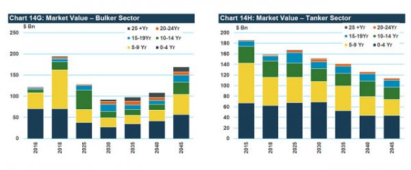 整體而言,2018年至2030年,全球干散貨船的價(jià)值將從1950億美元下降至900億美元。