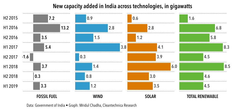 今年上半年,太陽能發(fā)電技術(shù)對印度新增發(fā)電能力的貢獻(xiàn)最大。在2019年1月至6月期間增加的7.8吉瓦新增產(chǎn)能中,太陽能占3.5吉瓦。