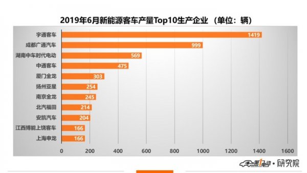 生產(chǎn)企業(yè)來看,2019年6月,新能源客車生產(chǎn)7049輛,出自48家客車生產(chǎn)企業(yè),與上月相比多出11家企業(yè)。宇通客車在新能源客車領(lǐng)域依然保持絕對霸主地位,依然是唯一一家單月產(chǎn)量過千輛的新能源客車生產(chǎn)企業(yè)。