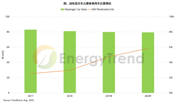 受惠于中國新版新能源車積分制度以及歐、美、日等市場規(guī)模擴大,油電混合動力車的市場商機備受關注。集邦咨詢旗下新能源研究中心集邦新能源網(wǎng)EnergyTrend預估,2019年全球油電混合車市占將達5%,相較之下,全球純電動乘用車僅2%。