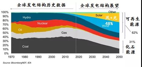 2019年7月,彭博新能源財經(jīng)發(fā)布了2019-2050年全球新能源市場展望,預(yù)計到2050年,風電和光伏將占全球電力系統(tǒng)近一半的裝機量,并在2030年前幫助電力行業(yè)保持在控制溫升2度以內(nèi)的軌道上。