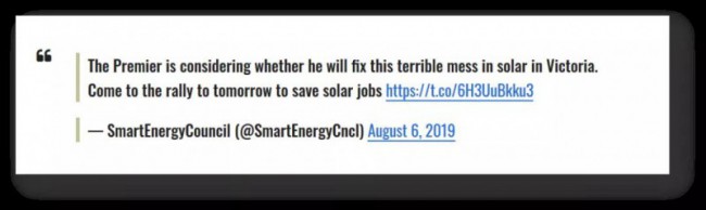據(jù)智慧能源委員會(huì)(SEC)公布的后續(xù)集會(huì)計(jì)劃,下一個(gè)活動(dòng)的低點(diǎn)將是澳洲總理丹尼爾•安德魯斯(Daniel Andrews)的辦公室,也就是發(fā)布和制定最新補(bǔ)貼政策的部門。