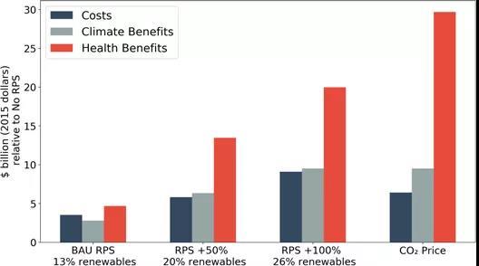 為了達(dá)到47億美元的數(shù)字,研究人員專注于各州目前的可再生能源組合標(biāo)準(zhǔn),這些政策要求公用事業(yè)公司從可再生能源中產(chǎn)生一定比例的電力。這些州的平均目標(biāo)現(xiàn)在設(shè)定為13%。但如果該地區(qū)的州將其可再生能源發(fā)電的比例提高到19.5%,那么2030年的健康效益將達(dá)到135億美元,而成本將達(dá)到58億美元。將其可再生能源使用量增加到其總能源組合的約26%將導(dǎo)致200億美元的健康效益,而實(shí)施成本將達(dá)到90億美元。該團(tuán)隊(duì)使用了一個結(jié)合經(jīng)濟(jì)和空氣污染模型的框架來得出他們的結(jié)論。