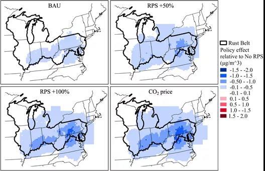 為什么會有這么大的回報?除了導(dǎo)致地球變暖的的溫室氣體之外,非清潔能源也會影響空氣質(zhì)量??茖W(xué)家量化的健康益處是限制接觸來自發(fā)電廠的細(xì)顆粒物質(zhì)的結(jié)果。并且有大量證據(jù)表明顆粒物或煙灰如何對呼吸和心血管健康產(chǎn)生不利影響。研究人員將研究重點(diǎn)放在賓夕法尼亞州、俄亥俄州、威斯康星州、密歇根州、伊利諾伊州、印第安納州、西弗吉尼亞州、新澤西州、馬里蘭州和特拉華州的原因之一是因?yàn)樵摰貐^(qū)的空氣質(zhì)量往往較差,這主要是這些地區(qū)更加依賴于煤炭等傳統(tǒng)能源。2016年,煤炭發(fā)電占鐵銹地帶(Rust Belt)電力構(gòu)成的42%。
