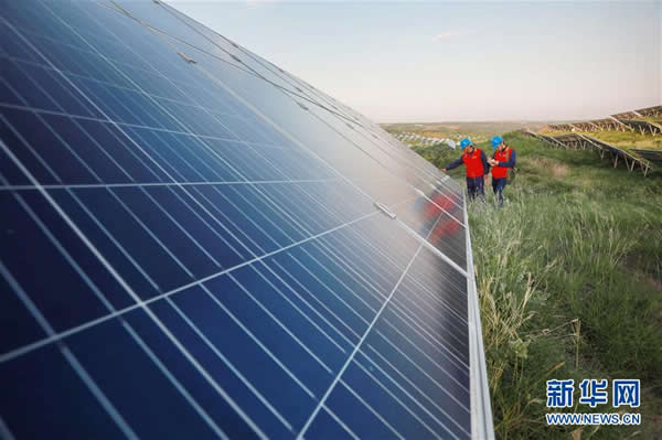 國網(wǎng)內(nèi)丘縣供電公司技術(shù)人員在內(nèi)丘縣柳林鎮(zhèn)虎頭山光伏電站內(nèi)巡檢(8月21日攝)。新華社記者 牟宇 攝