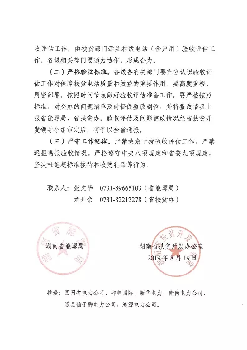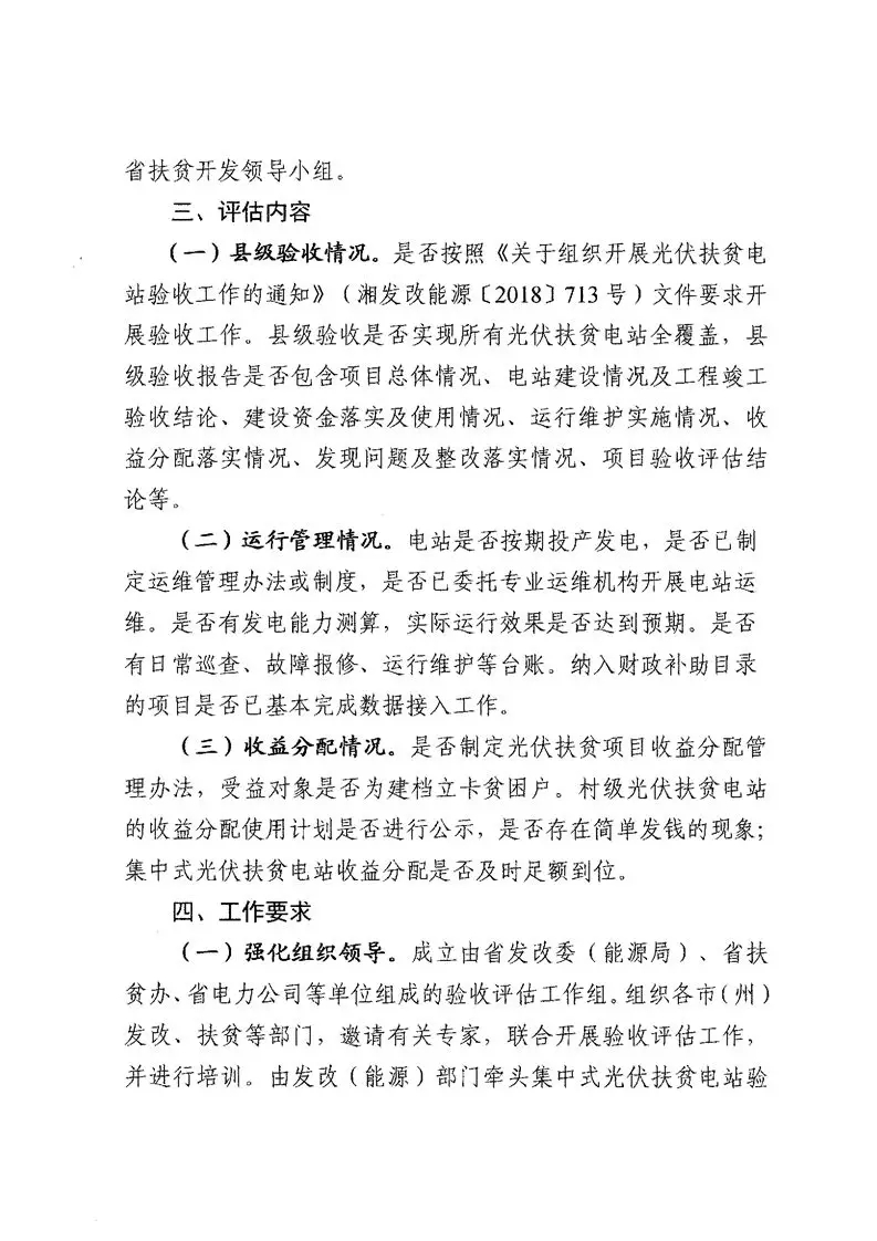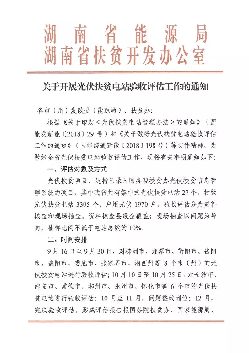 據(jù)文件要求:9月16日-9月30日,對(duì)株洲市、湘潭市、衡陽(yáng)市、岳陽(yáng)市、益陽(yáng)市、婁底市、張家界市、湘西州等8個(gè)市(州)的光伏扶貧電站進(jìn)行驗(yàn)收;10月10日-10月25日,對(duì)長(zhǎng)沙市、邵陽(yáng)市、常德市、郴州市、永州市、懷化市等6個(gè)市的光伏扶貧電站進(jìn)行驗(yàn)收;10月-11月,問(wèn)題整改到位;12月,完成驗(yàn)收評(píng)估。詳細(xì)情況請(qǐng)見(jiàn)原文。