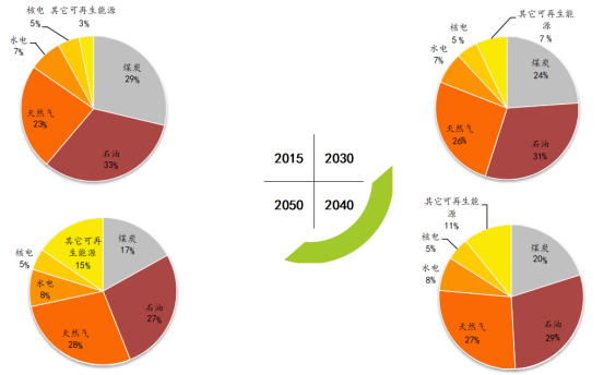 與之相對(duì)應(yīng)的是,人們?cè)诮K端用能的方面也會(huì)更側(cè)重清潔能源,煤炭和石油在能源消費(fèi)終端的占比都會(huì)下降。到2050年,煤炭占比快速下滑至8%左右,石油占比從2015年的45%降至38%,天然氣和電力占比較快提升。到2050年,天然氣和電力占比將分別達(dá)22%和28%。