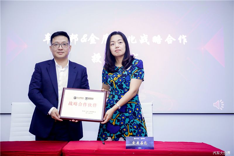 圖注:車主邦與金盾石化戰(zhàn)略簽約儀式上,車主邦能鏈聯(lián)合創(chuàng)始人孫臨瑋(左)向青島金盾控股管理公司總經(jīng)理劉曉翠進(jìn)行“戰(zhàn)略合作伙伴”授牌